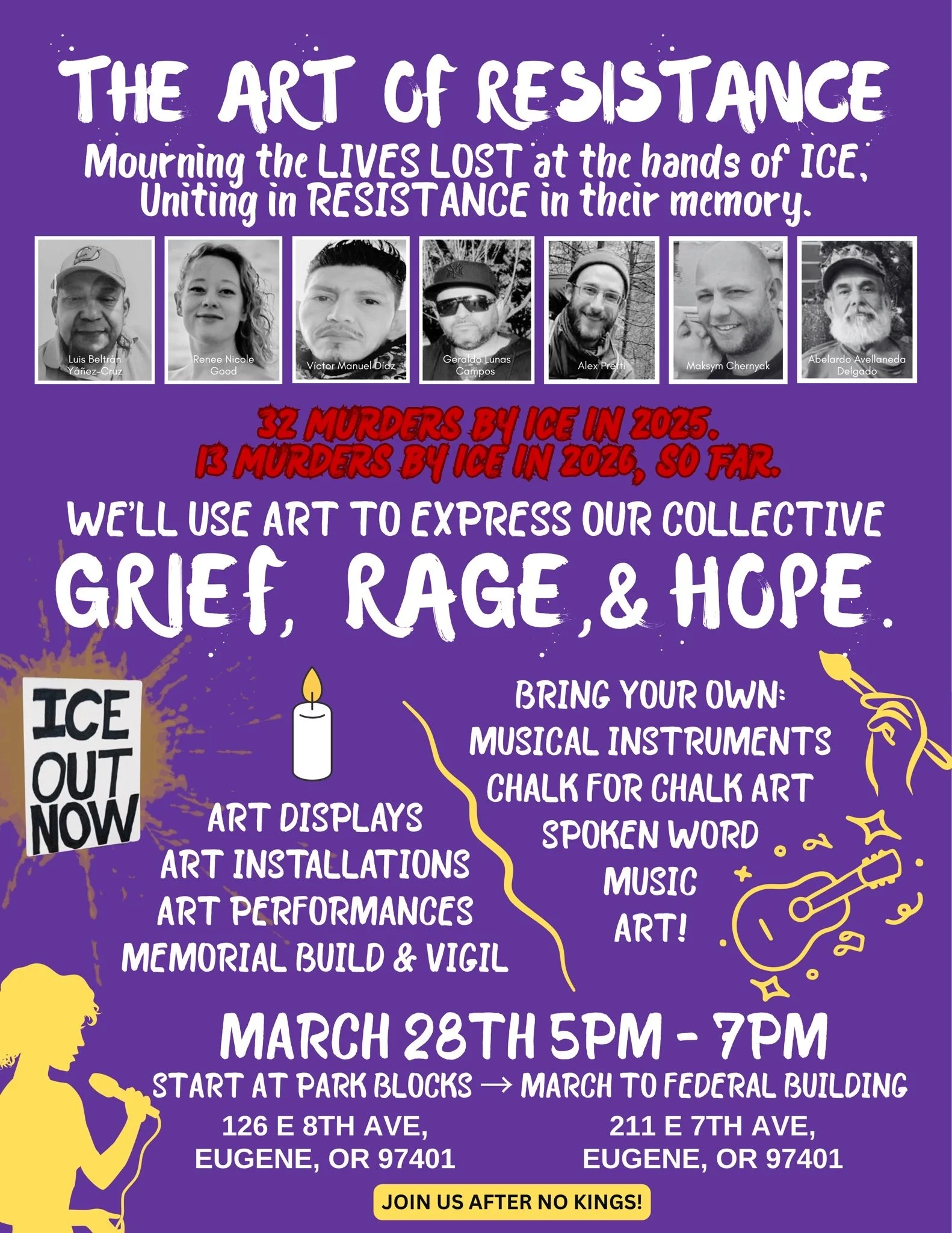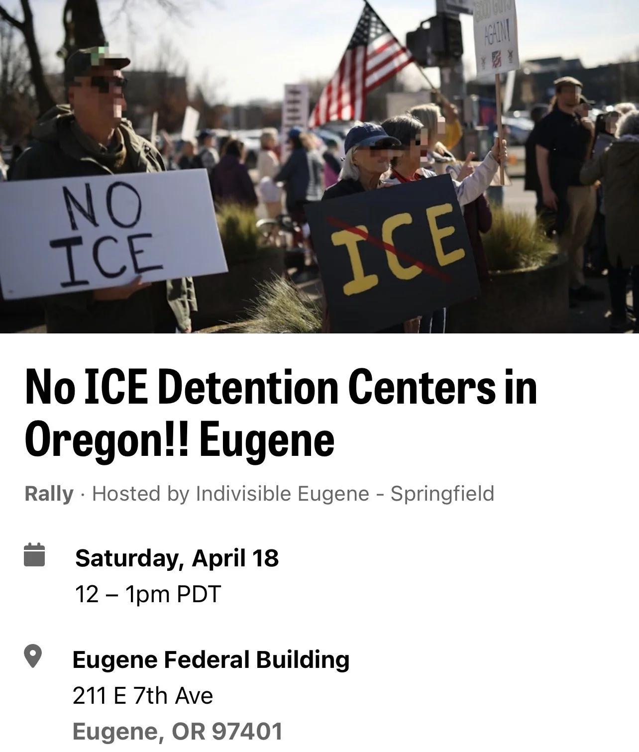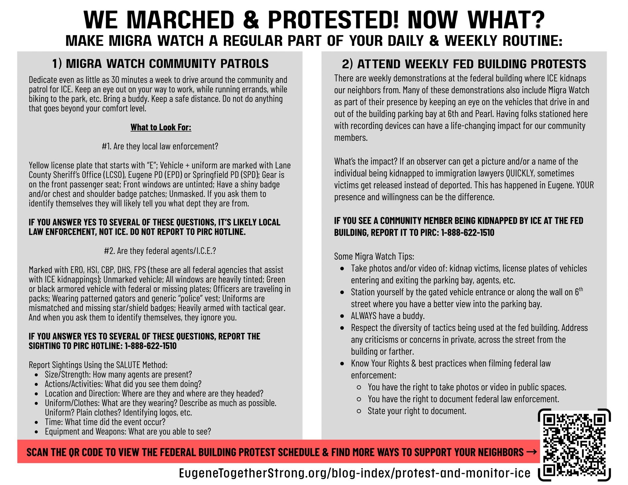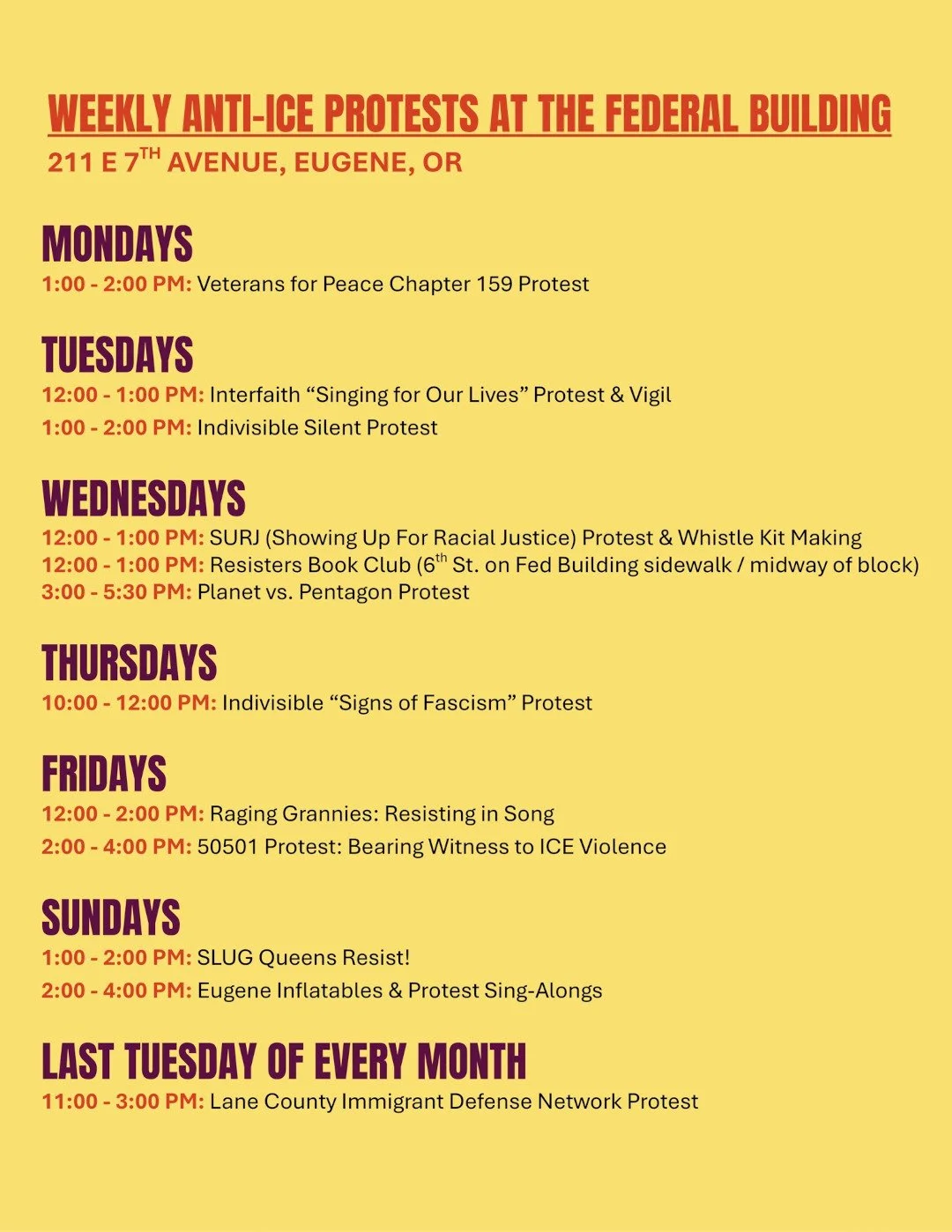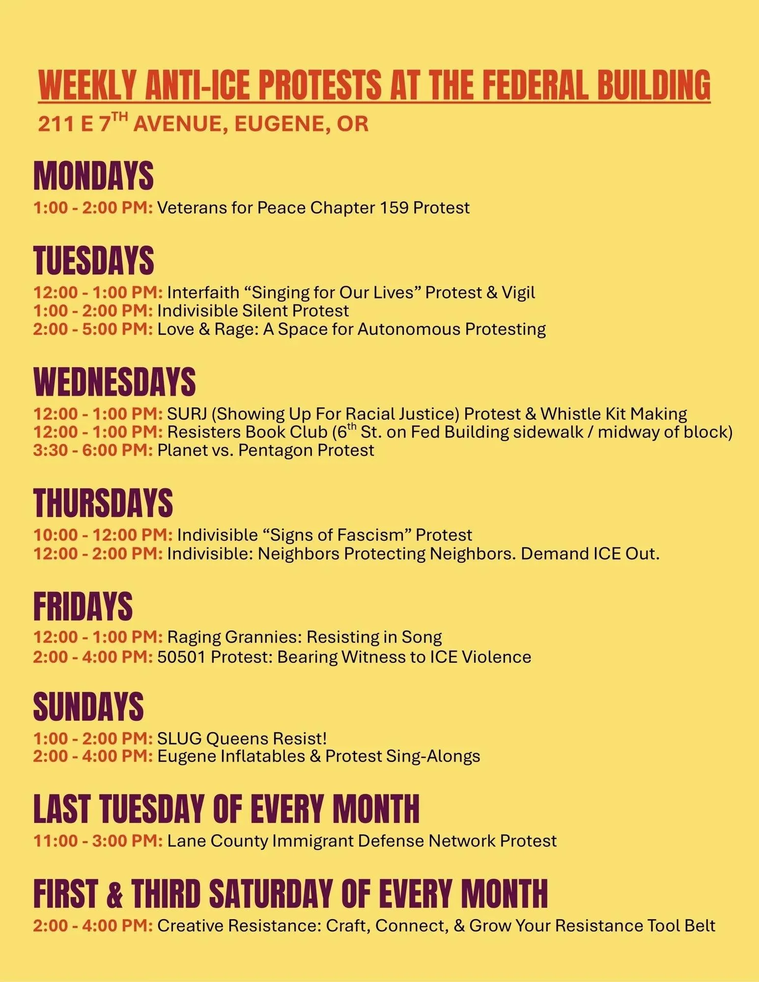 Here is the current schedule for ICE protests in Eugene, EVERY WEEK.